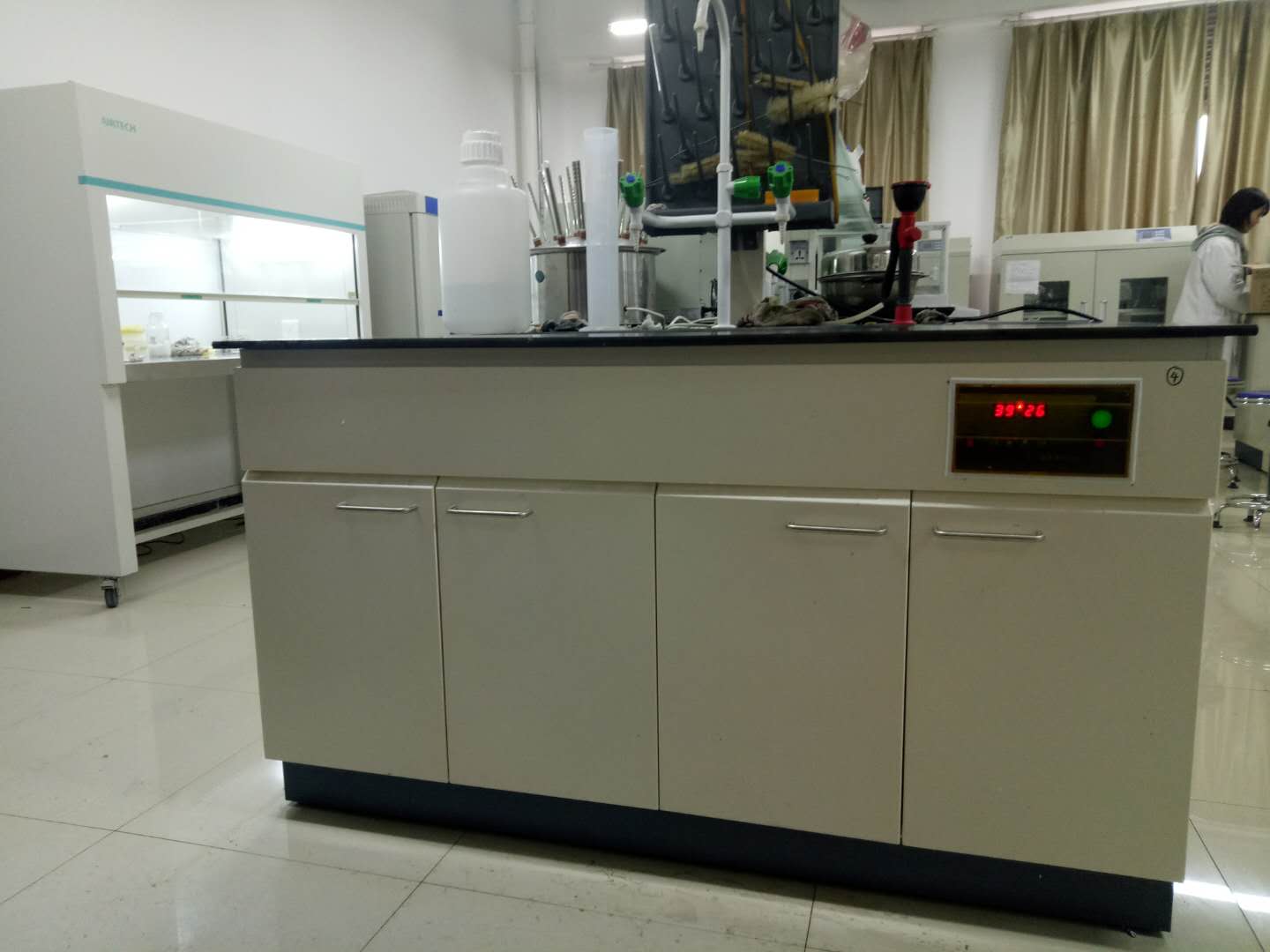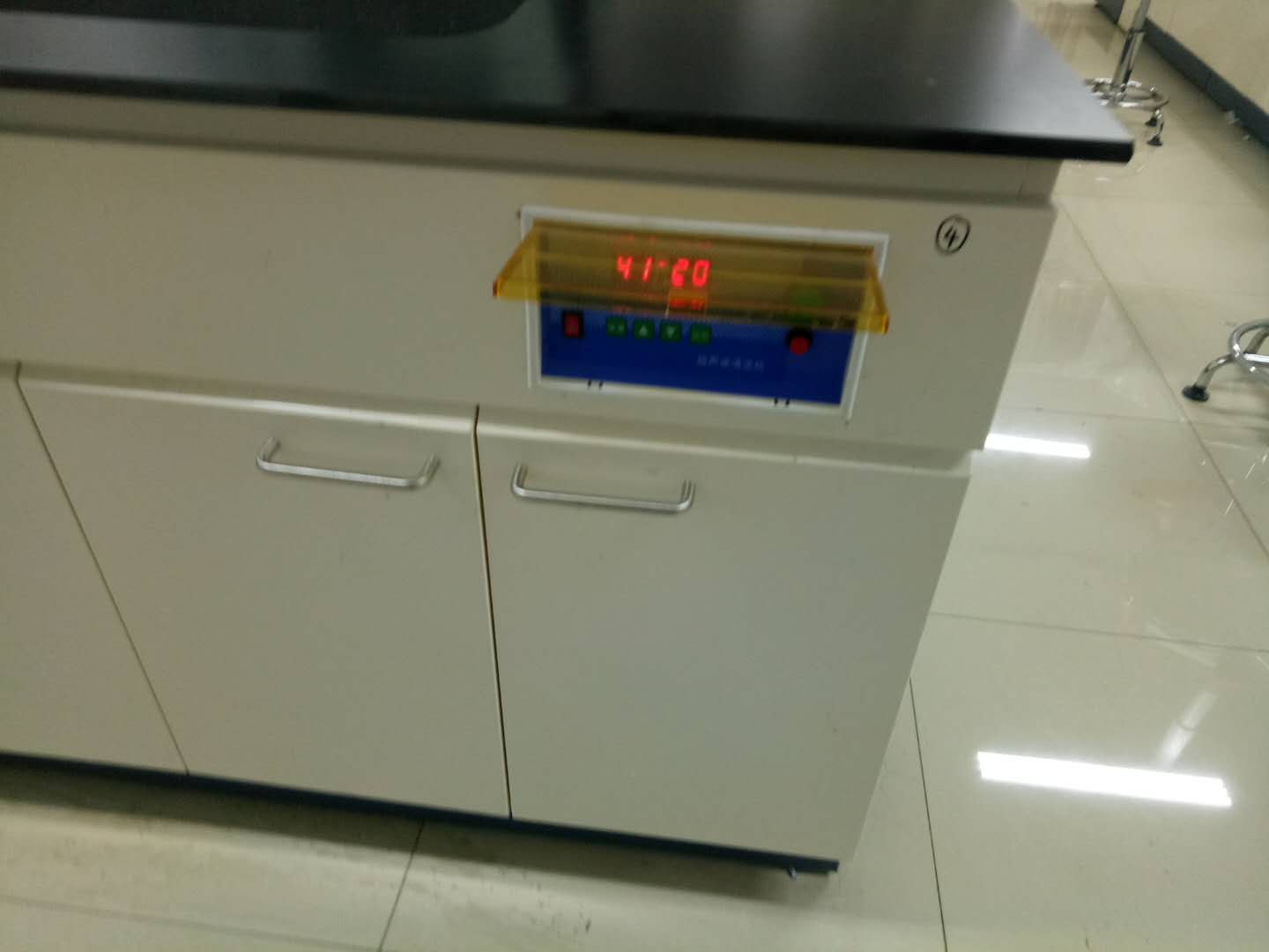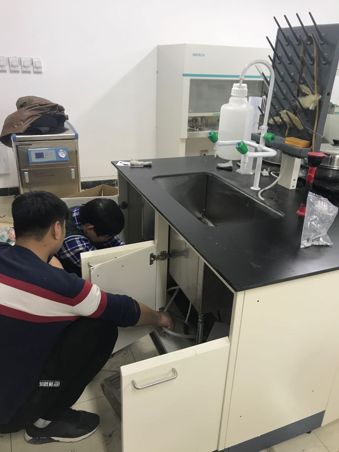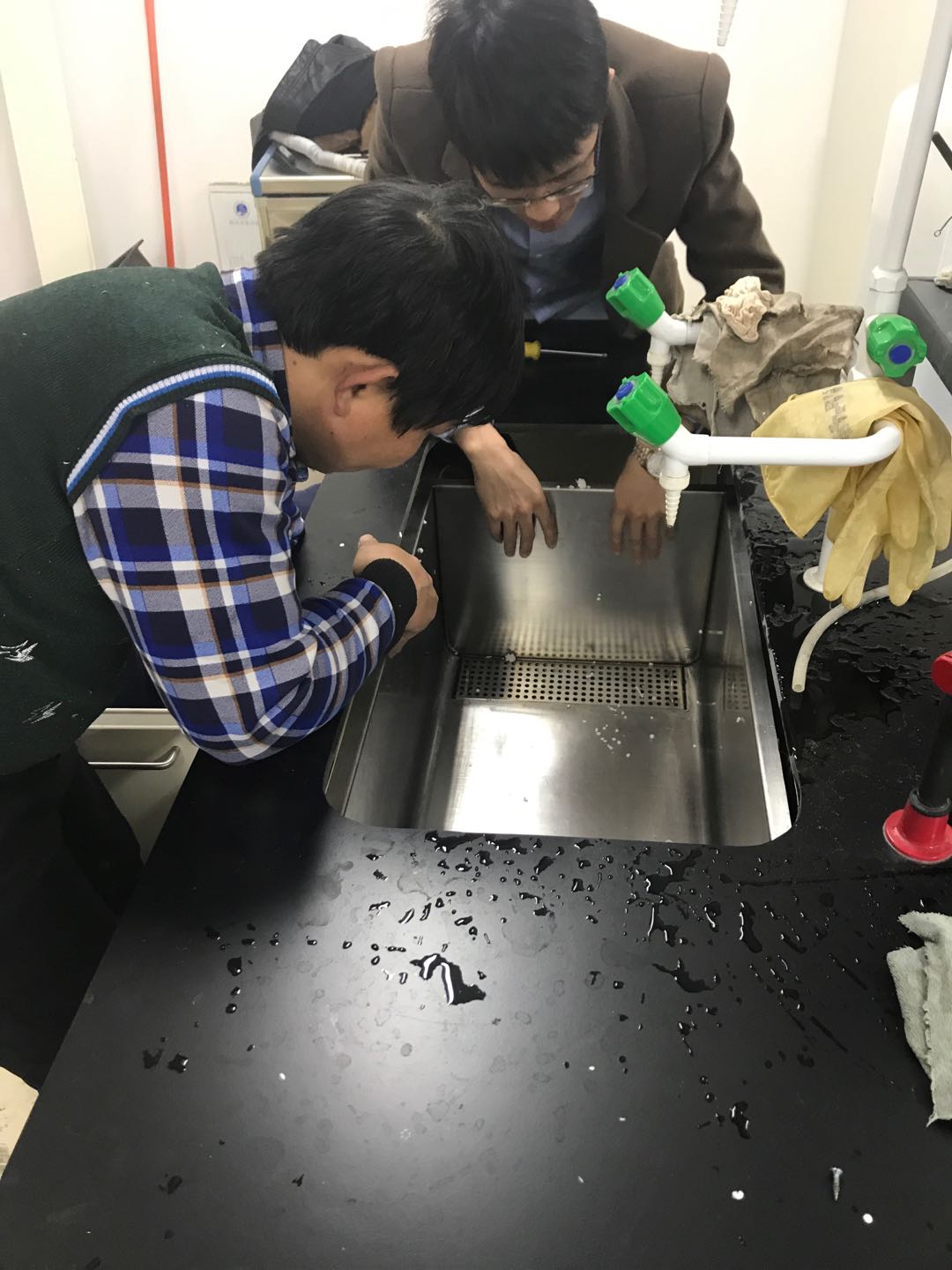 我公司根據之前謝主任提供的實驗臺內膽尺寸進行重新定制不銹鋼內槽和超聲裝置,我公司技術工程師將實驗臺原有的內槽取出,在實驗臺柜上打孔并進行安裝。